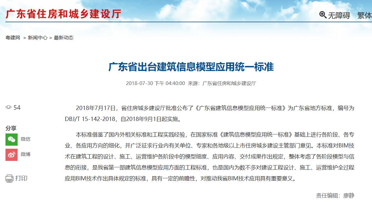 2018年7月17日,广东省省住房城乡建设厅批准公布了《广东省建筑信息模型应用统一标准》为广东省地方标准,编号为DBJ/T 15-142-2018,自2018年9月1日起实施。